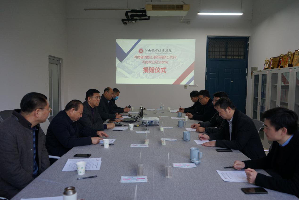 12月10日上午,我校校企合作单位河南省顶级汇装饰设计有限公司与学校签订资金捐赠协议,该公司捐赠50万元用于产业学院建设工作。仪式在龙子湖校区一号教学楼200-1室举行,副校长张卫宪、“顶极汇”有限公司董事长熊书国、总经理孙希明等领导出席仪式,校财务处、社会服务办公室负责人,澳门十大信誉网赌大全领导班子成员等同志参加,签字仪式由社会服务办公室主任胡迎利主持。