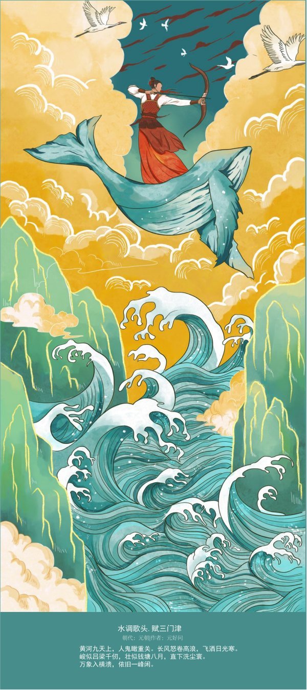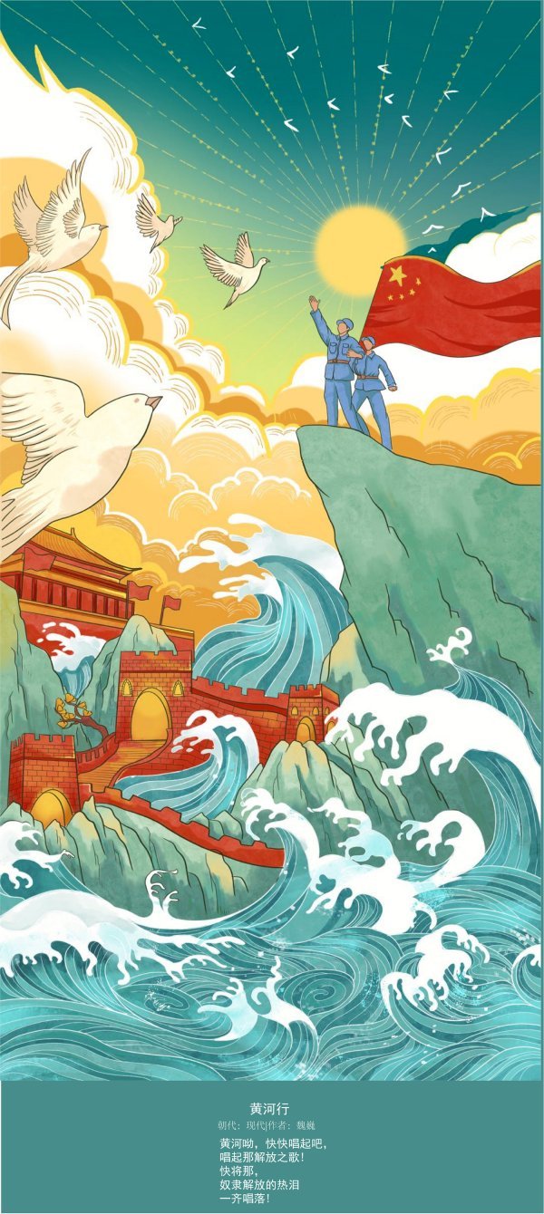这组插画借鉴国画传统手绘线描描绘黄河的波澜壮阔,用造型装饰表现和现代电脑手绘结合,同时借鉴宋代画家王希孟的《千里江山图》里的青绿、赭黄为主色调,完美体现传统与现代绘画技艺、现实与浪漫主义风格的融合。这组插画不光选取了大家熟悉的唐代诗人李白的《将进酒》《西岳云台歌送丹丘子 》、王之涣的《凉州词》《登鹳雀楼》、唐代诗人柳中庸的《征人怨》,还有大家不太熟悉的元代元好问的《水调歌头·赋三门津》、现代作家魏巍的《黄河行》、现代不知作者姓名的现代诗《小浪底》等诗歌作品,不仅表现了古代黄河气吞山河的气势磅礴,还表现了现代黄河儿女改天换地、黄河两岸经济繁荣、安居乐业的场景,昂扬着中华民族生生不息、再现从古到今黄河文化的华彩篇章。同时也展现了澳门信誉最好十大平台澳门十大信誉网赌大全在贯彻落实习近平总书记做出要“扎实推进黄河流域生态保护和高质量发展”的重要指示,不断提升专业教学质量,贴合时代精神、传承黄河文化创新发展的教学成果,更展现了我校师生在疫情防控常态化学习工作中,传承中国文化、奋发进取的精神风貌。