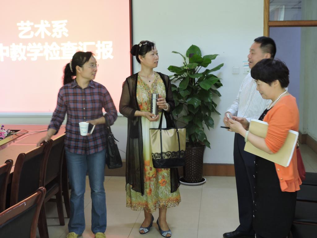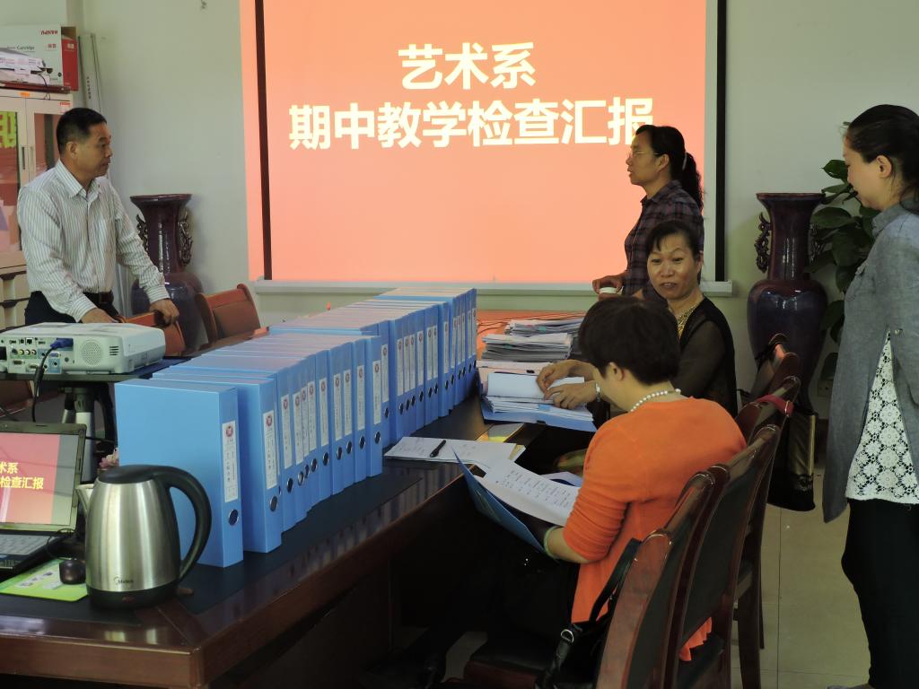 检查组成员首先对任课老师的上课情况进行了随机抽查并深入课堂进行了听课;随后对艺术系本学期教学相关材料及教学档案建设情况进行了认真细致的检查;最后深入到教研室,对艺术系学生作业的提交、评阅情况进行了抽查。检查组对于艺术系的教学工作和教学档案建设给予了充分肯定,同时对于存在的问题也提出很好的意见和建议。一是课堂上还存在学生不认真听课而玩手机现象;二是系里缺少专门的档案资料室;三是艺术系作为一个教职工人数70多人的大系,教研室只有一个大房间,所有教研室老师都集中在一起显得特别拥挤,专业老师的办公条件有待改善。