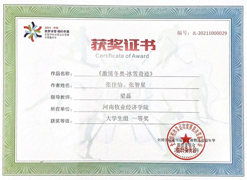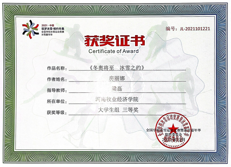 第三届全国学校冰雪创意设计大赛以“筑梦冰雪·相约冬奥”为主题,旨在积极探索冰雪产业人才培养,为建设冰雪产业提供人才支撑,进一步推广普及校园冰雪运动,加强校园冰雪师资队伍建设,引领学生参与冰雪活动,培养学生冰雪运动兴趣。大赛组委会共收到来自全国27个省、市、自治区,161所大学提交的11192件参赛作品。我校参赛作品《激情冬奥 冰雪奇迹》荣获一等奖,作品《冬奥将至 冰雪之约》荣获三等奖。