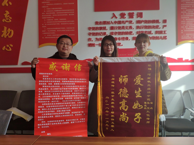 “爱生如子,师德高尚”。 不仅是对学校的肯定和鼓励,更是一种鞭策、激励。11月12号上午,两位心情激动的家长把锦旗和感谢信交到澳门十大信誉网赌大全的领导手中,感谢视觉传达教研室姜薇薇、张莹、梁磊三位老师的爱心关怀。