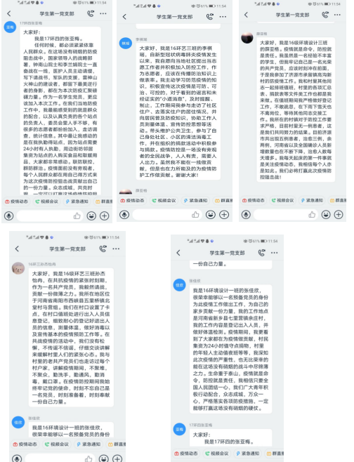 会议第三项,韩飞书记对近期的工作以及未来的工作进行了总结与布置,他强调了三个方面,第一,学校已经开展了线上每日打卡,无论是学生还是教职工一定要认真打卡,做到自己实际情况的汇报,辅导猫的两处打卡,和教育厅近期下发的“新型冠状病毒肺炎个人健康情况填报系统”的二维码打卡,都要认真落实到位。第二,青年大学习的近几期也有在更新,希望同学们做好自己的本职工作,不能落下,保质保量的完成学习打卡工作。第三,韩飞书记再次强调,号召大家积极参加各自社区、村委会、居委会组织的志愿者活动,投身于身边一线的防疫工作中去,学习身边优秀党员。这次危机,对我们党以及全体党员、干部来说,是一场大考验。以习近平同志为核心的党中央坚强领导下,紧紧依靠人民群众,和我们党员的冲锋陷阵,我们一定能够赢得这场大考,向人民向历史交上一份合格的答卷。