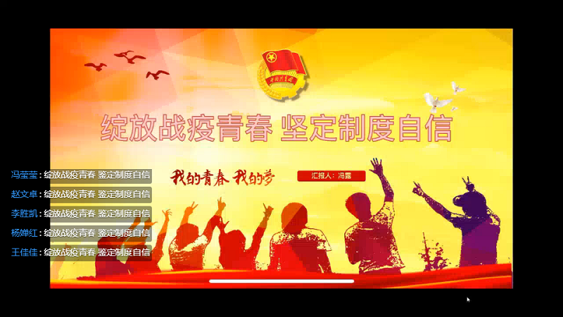 2020年4月23日下午,澳门信誉最好十大平台澳门十大信誉网赌大全在钉钉会议群上举行了以“绽放战疫青春,坚定制度自信”为主题的团课,本次团课,由大一班级全体参与。