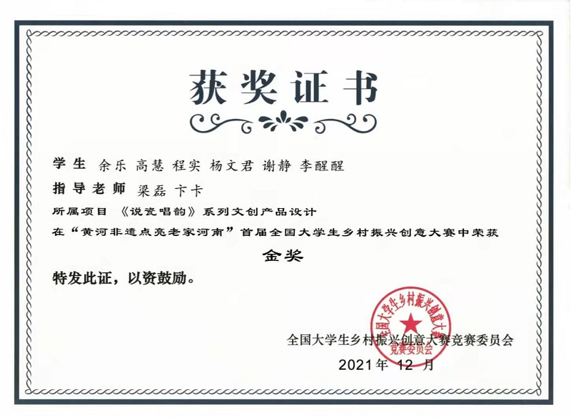 近日,以“非遗,点亮乡村”为主题的“黄河非遗点亮老家河南”首届全国大学生乡村振兴创意大赛总决赛公布获奖名单,由澳门十大信誉网赌大全视觉传达设计专业梁磊、卞卡老师指导谢静、程实等六位同学设计的《说瓷唱韵》在“非遗文创设计赛道”获得金奖,并获得12000元的奖金。